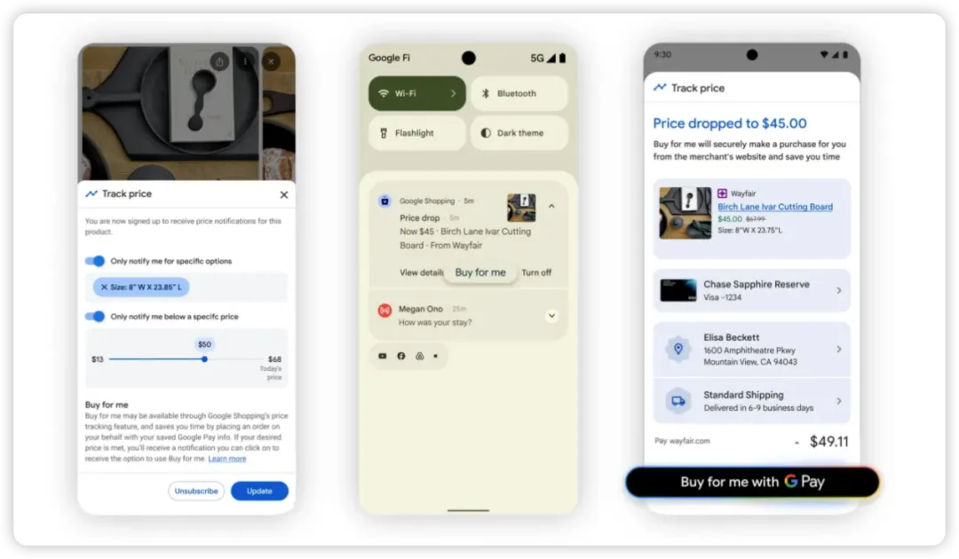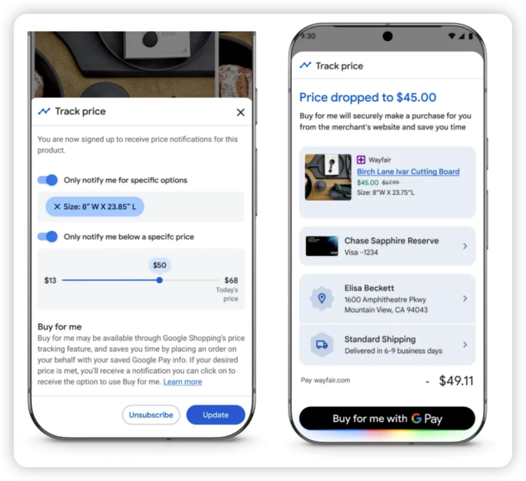 此外,用户可以让 Gemini 帮忙“持续追踪产品的价格”,以免因产品降价而错过购买时机。例如,用户要购买一个砧板,可以先设置砧板的尺寸(8*25 英寸)和价格区间(13-50 美元),当该产品的价格达到用户的期望值(比如 45 美元),Gemini 就会通知用户下单。