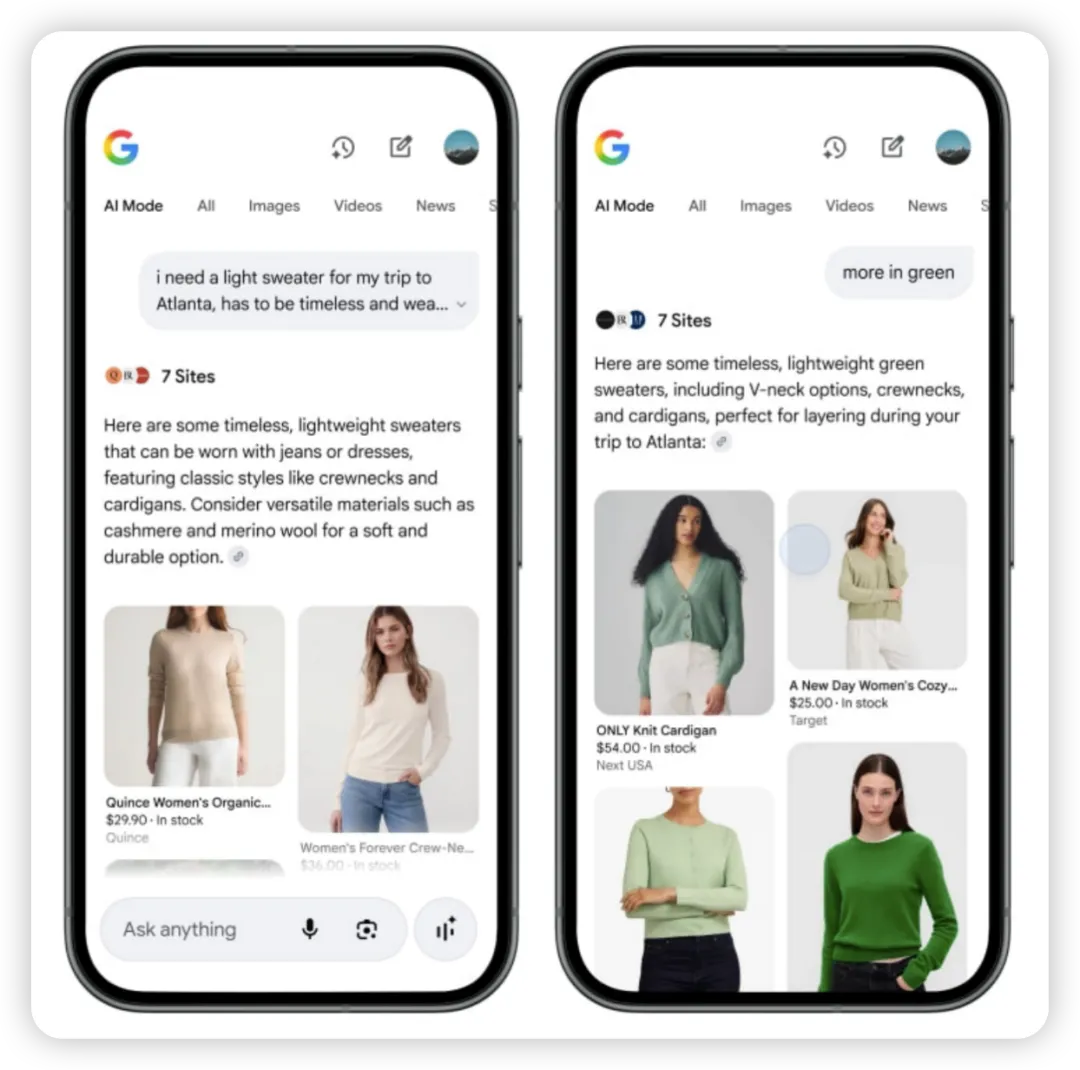 例如,美国用户在 Gemini 对话框内提出“我去亚特兰大旅行,需要购买一件轻薄、经典、百搭款的毛衣,并且能搭配牛仔裤和连衣裙”,Gemini 就能推荐出各种品牌的毛衣,用户还能根据提示,在结果页中不断完善购物需求,比如继续提出“更多的绿色款式”等需求。