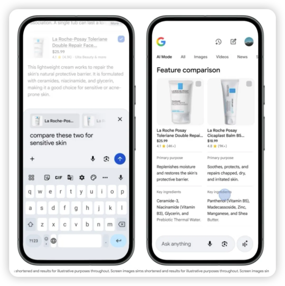 这样一来,两者形成了良好的配合。Gemini 主要理解用户“想买什么”,而 Google Shopping 所沉淀的商品数据库,决定了用户“能买到什么”。