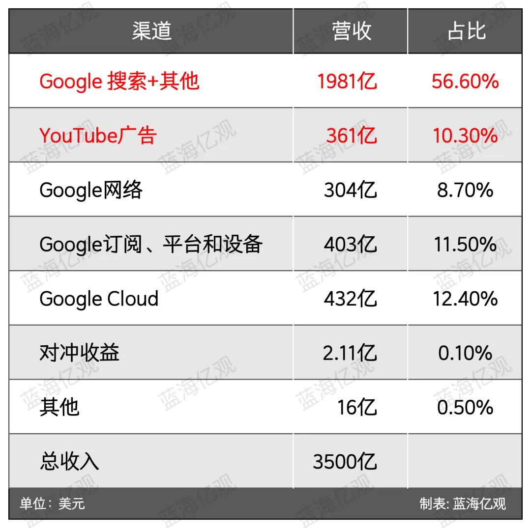 谷歌的核心收入来源是广告(包括“购物广告”),2024 年,谷歌母公司 Alphabet 总营收 3500 亿美元,其中,来自搜索与 Youtube 的广告收入,合计占比约 66.9%。