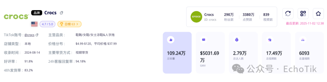 据 EchoTik 数据显示,截至 11 月 2 日,Crocs 的美国小店总销量突破 109 万,总销售额达到接近 5032 万美金,近期热度飙升,近一个月的预估销售额达到了约 740 万美金!该品牌小店好评率高达 91.8%,产品平均价格区间在 40 美金左右,产品价格段和品牌调性深度契合 TikTok 主流受众——「千禧一代」和「Z世代」的消费水平和审美。