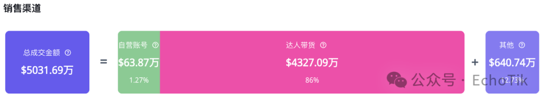 小店的 86% 销售额由达人带货直接产生。12.7% 的销售额则通过橱窗、货架等渠道出单,仅不到 2% 的销售额来自于自营账号。