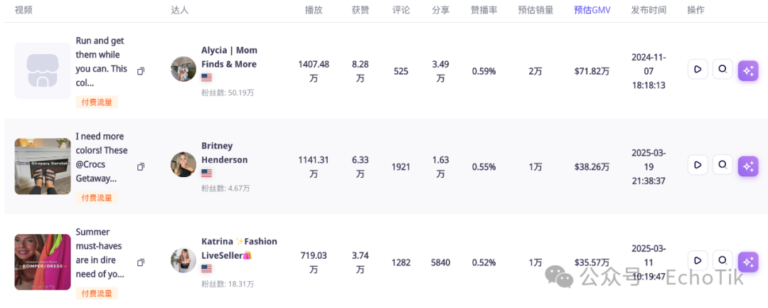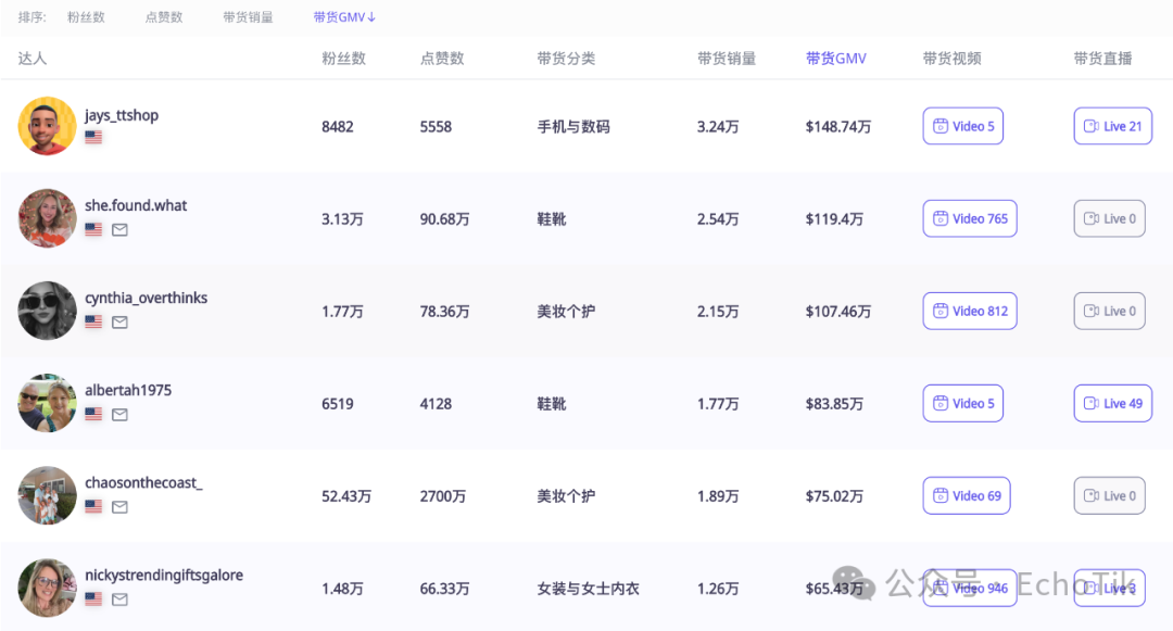 根据 EchoTik 数据,Crocs 的带货达人的类型覆盖多个年龄层的群体。令人惊讶的是带货 GMV 最高的反而是粉丝不足 1 万的尾部达人。@jays_ttshop 为 Crocs 录制了 5 个带货视频,并展开了 21 场带货直播,带货 GMV 接近 150 万美元。