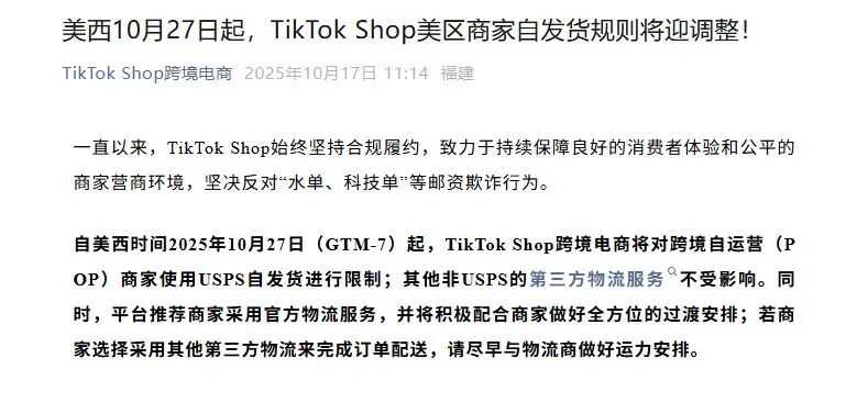 TK出海日志获悉,10月17日,TikTok Shop跨境电商公众号发布美区物流新规,10月27日起将全面限制商家使用USPS自发货,非USPS类第三方物流(UPS、FedEx、DHL等)可正常使用。
