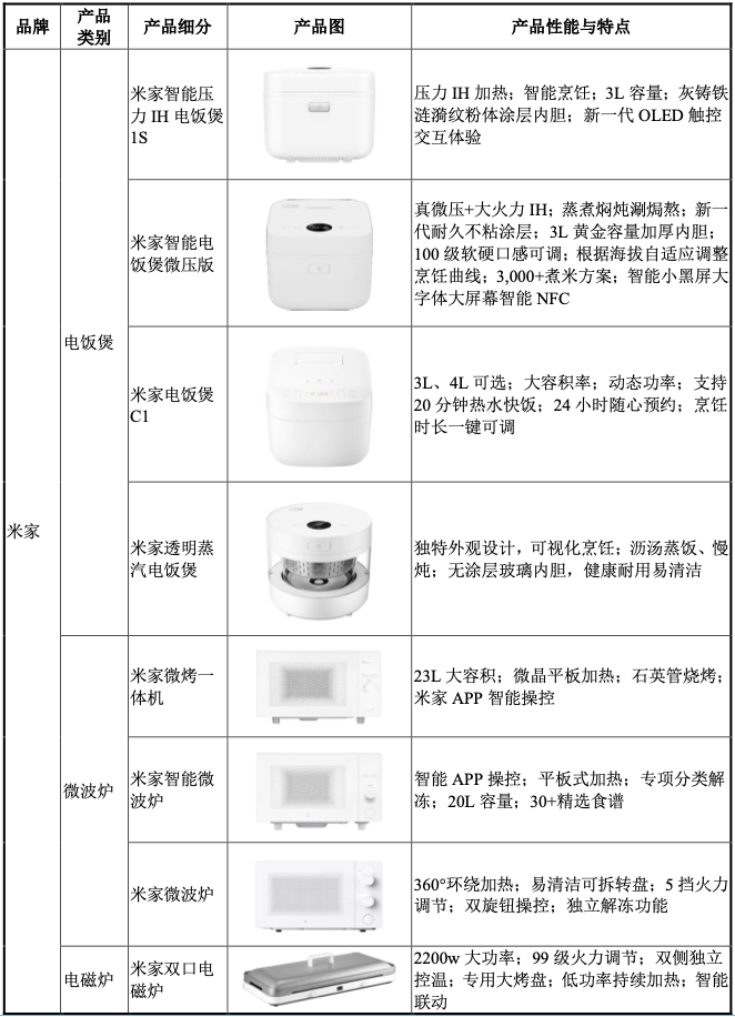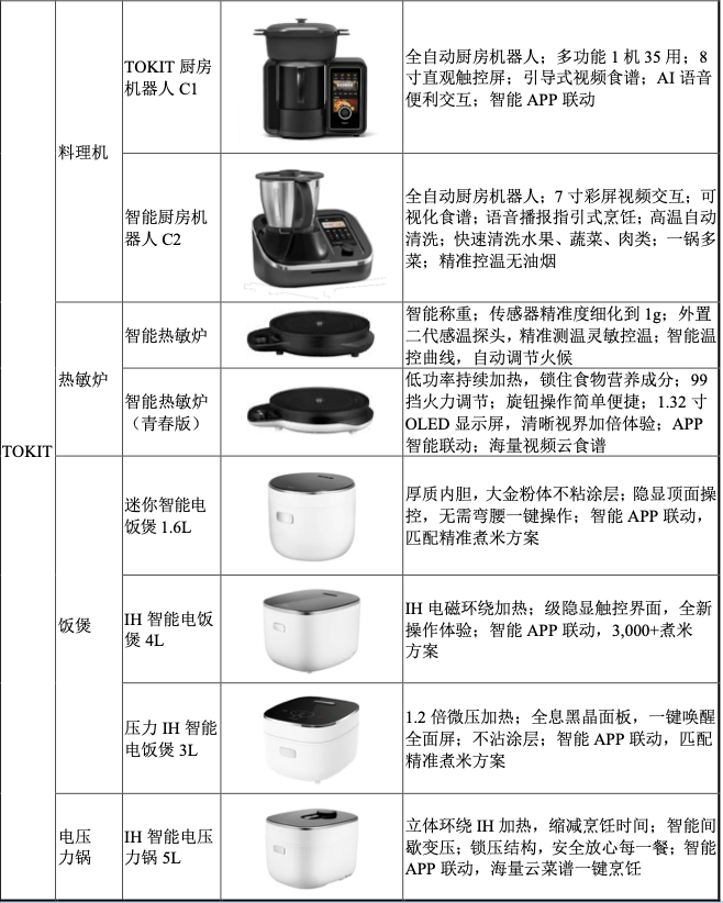 公司自成立以来,始终专注于智能小家电领域,不断拓展延伸产品品类。公司是依托智能 IoT 软硬件研发实力,为智能烹饪、水健康等生活场景提供整体解决方案的国家高新技术企业,被评为上海市“专精特新”中小企业。公司产品按应用方向主要分为厨房小家电、生活小家电和其他周边产品。其中,厨房小家电主要包括电饭煲、料理机、微波炉、电磁炉、养生壶、破壁机、电烤箱、空气炸锅、电压力锅、电蒸锅、电煮锅、破壁机等;生活小家电主要包括净水类产品等,其他周边产品主要包括锅具、杯具等。公司的自主品牌主要包括 TOKIT、圈厨、知吾煮、joyami 等。