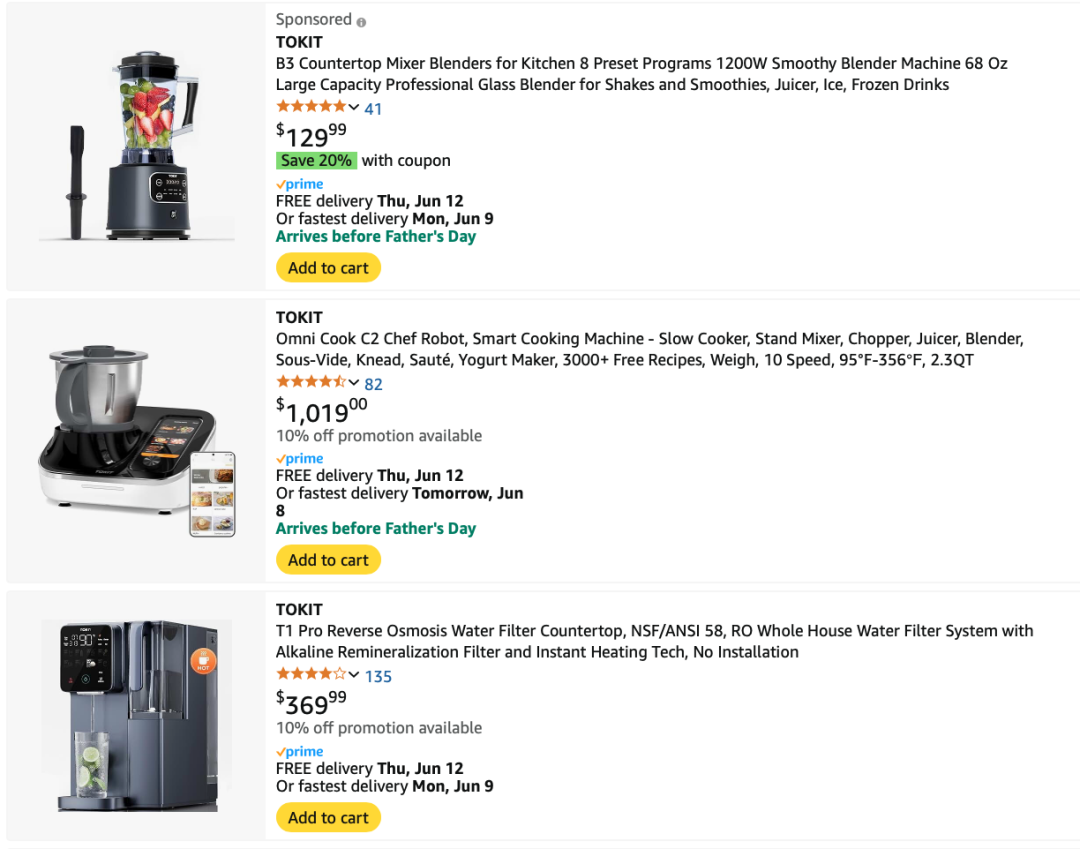 在亚马逊美国站及英国站,TOKIT 品牌的厨房电器产品均有不错的表现。