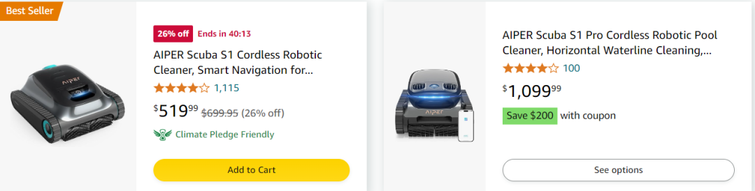 在首款产品取得成功后,Aiper 也并未放慢脚步,而是针对消费者的不同需求,又相继推出了 Seagull、Scuba 以及 Surfer 系列等多款泳池清洁机器人产品。在亚马逊平台上收获消费者的广泛好评,一度登顶畅销榜榜首。