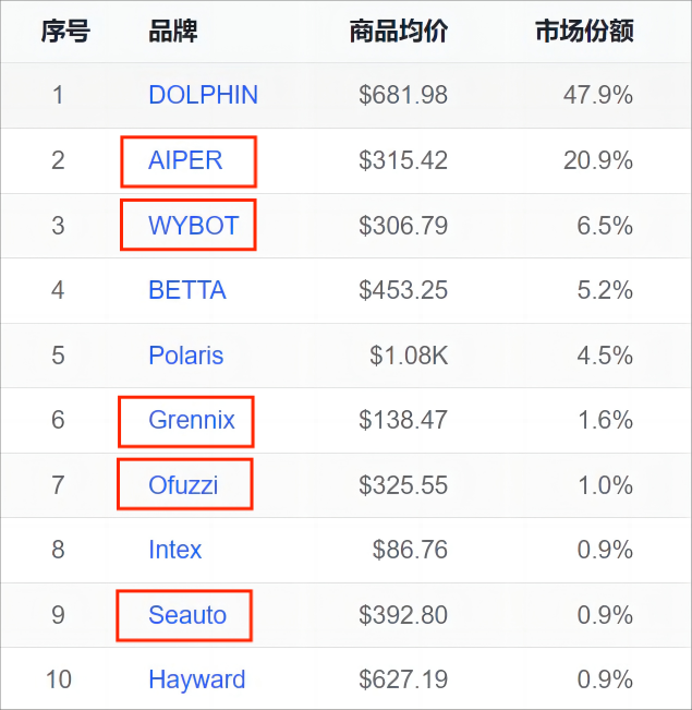 根据魔镜洞察数据,2023 年亚马逊美国站上,泳池机器人总销售额达 3.3 亿美元,较前一年增长 23.5%。这其中,国产品牌占据重要地位,平台销量前十的品牌里,有五家来自中国,市场份额总计 31%,与前一年的 15.9% 相比几乎翻倍。