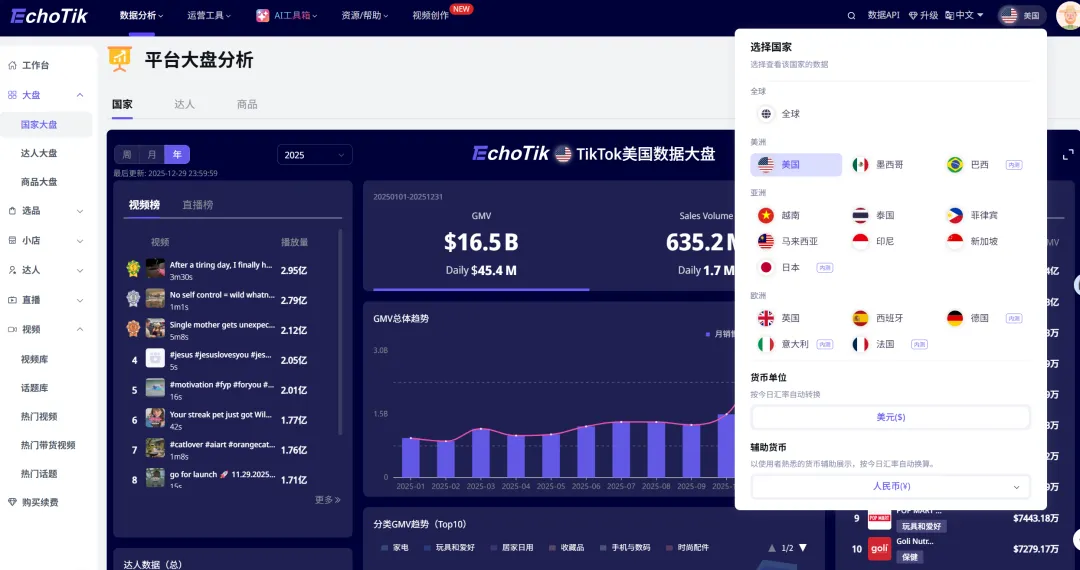 本报告结合EchoTik数据,将从全球市场格局分级、各区域核心市场热销品类深度解析、月度GMV波动规律与驱动因素、2025年核心增长逻辑总结四大维度,完成2025年TikTok Shop全球市场的深度复盘,并基于市场演进趋势,为商家提供2026年可落地的战略布局建议,助力商家把握全球社交电商红利。