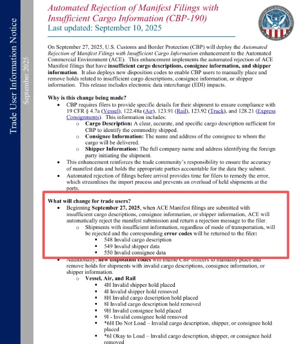 2025 年 9 月 27 日,美国海关完成 ACE 自动化商业环境系统升级,舱单数据审查从人工抽样改为系统全量自动核查,同时新设快速文件审查部门(FAST DOC REVIEW),专攻进口商资质与单证一致性审核,为 5H 查验率暴涨埋下伏笔。