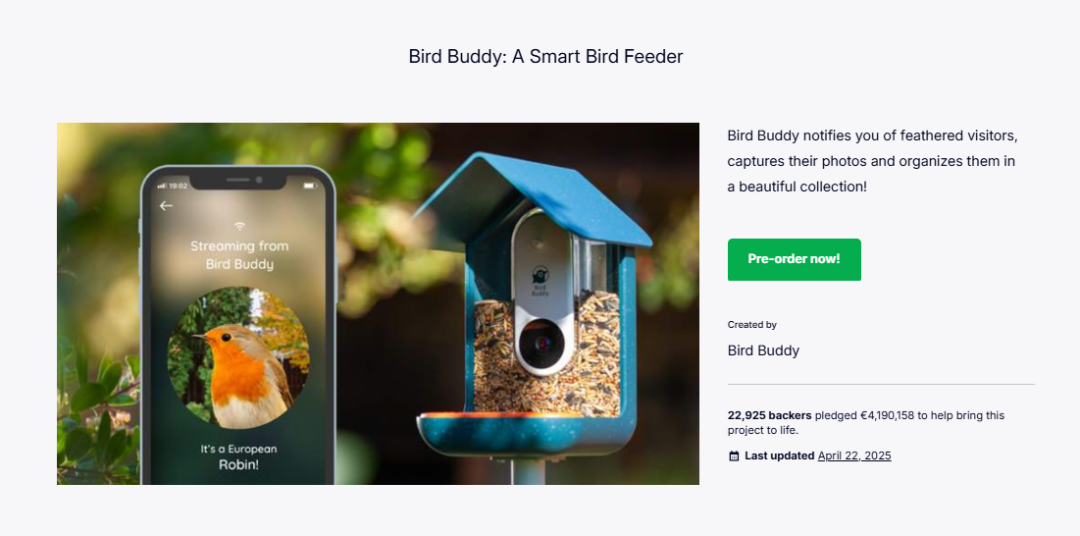 自2020年诞生以来,Birdbuddy一路“高歌猛进”,市场表现相当亮眼。在上线前期,其在众筹平台Kickstarter便展现出强大的吸金能力,以199美元的售价,成功筹集到419万欧元,收获了2.3万名支持者,远超5万欧元的初始目标。这一成绩不仅彰显了产品创意的吸引力,更预示着其广阔的市场前景。