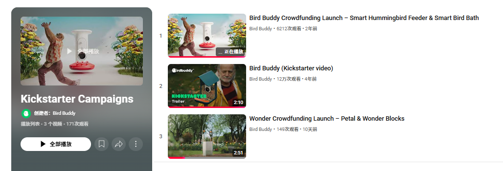 Birdbuddy以 YouTube 账号为核心阵地,在YouTube平台打造了层次分明的立体化内容体系,实现了从产品功能到精神共鸣的价值跃迁。其发布的视频主要分为以下四个板块: