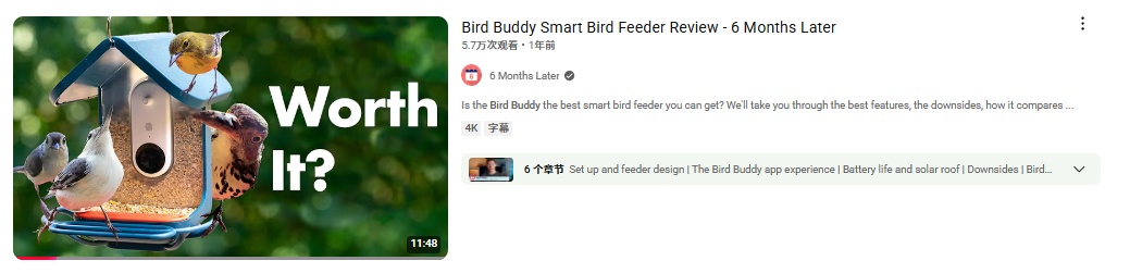 Birdbuddy联合腰部测评博主@6 Months Later 推出 11 分钟长视频测评,视频以多维度视角展开。视频中,博主不仅深入解析了产品安装流程与喂食器精巧的结构设计,还生动展示了 Birdbuddy 应用程序直观的交互界面、便捷的功能操作等使用体验;既详细介绍了电池续航能力、太阳能板的充电原理与实际效能,也客观分析了产品现存的短板,此外还着重阐述了 Birdbuddy Pro 版本的全新升级亮点与特色功能,最终对产品的综合性能进行了全面总结与专业推荐。