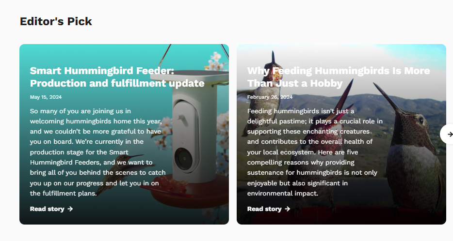 聚焦智能蜂鸟喂食器这一核心产品,同时融入蜂鸟科普知识。围绕产品从生产、预购到交付的全流程进行内容呈现,且科普内容与产品应用场景紧密关联,为用户提供从产品了解到知识拓展的一站式信息。