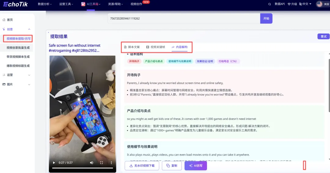 TikTok销量第一,爆款脚本思考!打开EchoTik,3C类目周榜销量第一,产品带货脚本;一、脚本核心优点(纯产品使用场景,卖点展示)1. 痛点切入极快,精准戳中家长核心需求开篇直接锚定家长两大焦虑:「屏幕时间管控」「上网安全」,没有多余铺垫,3 秒抓住目标人群注意力(TikTok用户停留时间短,黄金3秒决定留存);紧接着给出解决方案(不用网、内置游戏),形成「痛点→解药」的快速闭环,符合TikTok短视频「即时价值传递」逻辑。