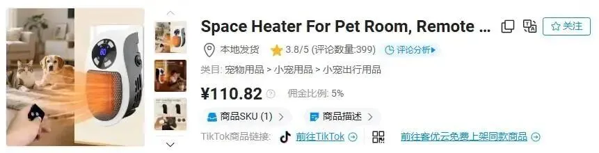 一款迷你宠物取暖器在 TikTok 美区单月销售额近 100 万元,成功跻身当地宠物用品类目热销榜单。TKFFF 发现,该产品凭借场景化营销实现跨类目突破,先是依托浴室场景打开家用取暖市场,转战宠物类目后,依旧保持着亮眼的销售成绩。
