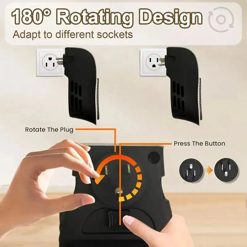 此外,电暖器插头支持 180° 旋转,能适配不同类型墙壁插孔,兼顾宠物房、浴室、卧室等多场景临时取暖需求;同时内置过热保护功能,温度过高时会自动断电,有效规避安全隐患。