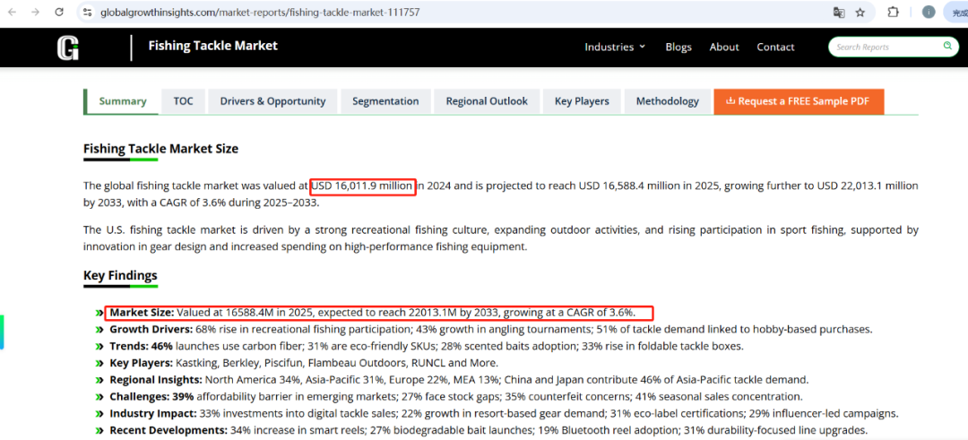 据 Globalgrowthinsights 数据显示,2024 年全球渔具市场规模达 1601 亿美元,预计 2025 年增长至 1658 亿美元,2025 至 2033 年间年均增长率为 3.6%。