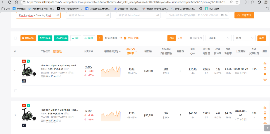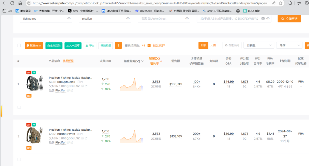 在亚马逊钓鱼背包品类中,Piscifun 表现尤为突出。一款 Travel X 背包在亚马逊月销超 3500 件、销售额达 16 万美元。更值得注意的是,该品牌共有9款钓鱼背包单月销售额突破 10 万美元。