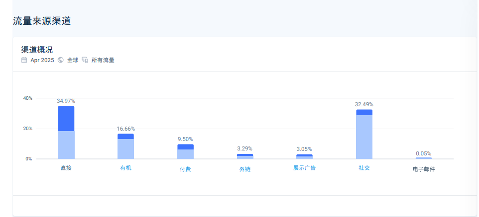 流量来源中,直接访问占比 34.97%,社交平台占比 12.09%,体现出较高的品牌忠诚度和稳定的社媒影响力。