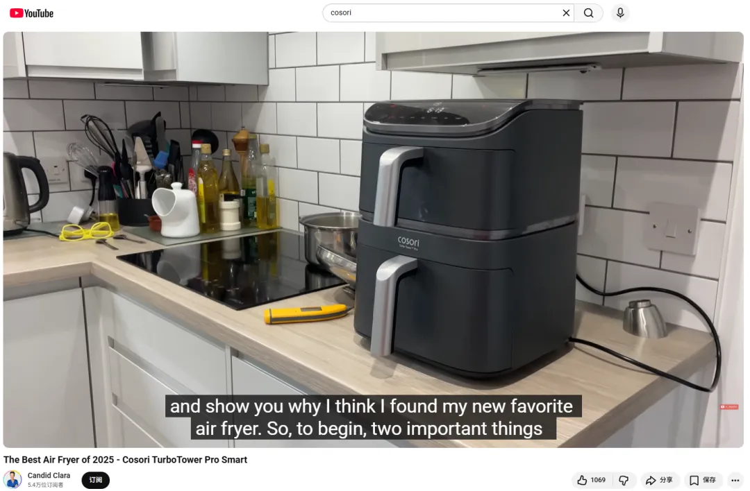 而在YouTube上,COSORI则重点合作垂直家电测评红人,比如@CandidClara,这位博主是家电测评专家,77%的内容聚焦厨房小家电,其中46%是空气炸锅测评,粉丝都是“理性决策、注重品质”的用户,正好契合COSORI高端系列产品的定位。
