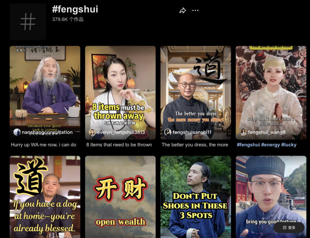 打开 TikTok,我们发现#fengshui(风水)、#ChineseZodiac(中国生肖)、#FiveElements(五行)相关话题的视频播放量竟然超过 10 亿次。