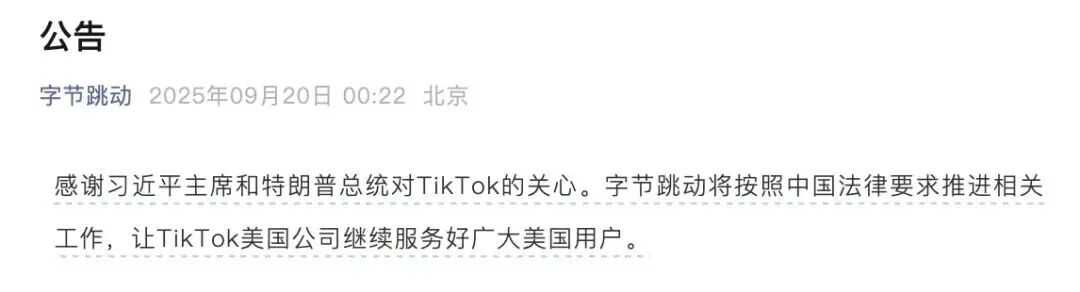9 月 20 日凌晨,字节跳动发布公告称,将按照中国法律要求推进相关工作,让 TikTok 美国公司继续服务好广大美国用户。