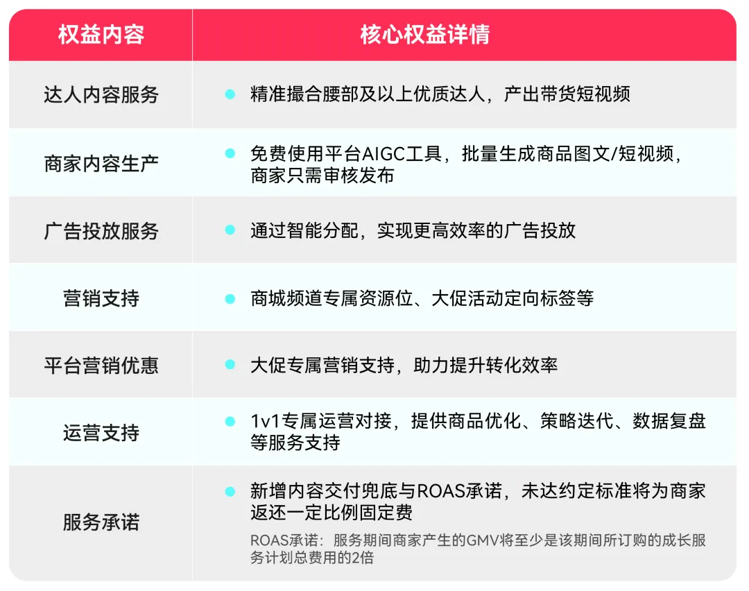 • ROAS承诺:项目周期ROAS(项目期间GMV/项目费用投入)≥2,若未达标,按照固定费的50%返还Ads credit(广告金)