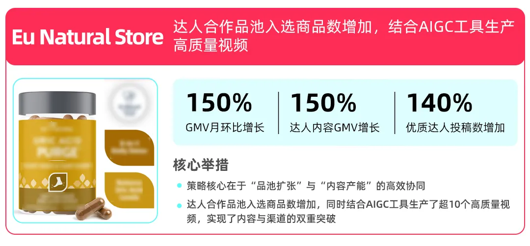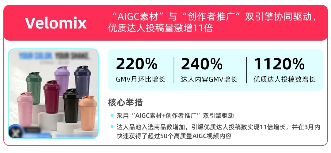 已经有众多参与TikTok Shop跨境POP商家成长服务计划(Managed Service Plan)的商家成功收获生意增长。以Velomix、Aecooly.us、Eu Natural Store为例,尽管品类各异,但他们的增长路径均围绕达人合作、AIGC内容提效,实现了投稿量与GMV的双重爆发。