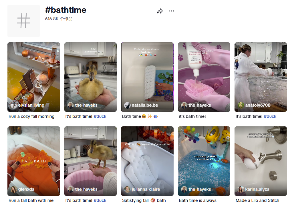 在 TikTok 上,带有 #bathtime(沐浴时间)、#bath(沐浴)标签的作品分别有 61.68 万条、95.29 万条,用户们分享着沐浴前的一系列仪式和好物。