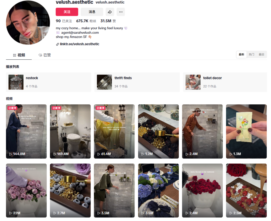 家居博主 @velush.aesthetic 通过分享其精致的泡澡仪式吸引了大量关注。