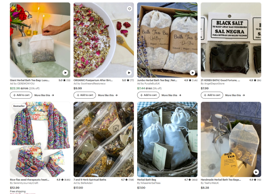 在 Etsy、Amazon 等电商平台上,中草药浴包也呈现出强劲的销售势头。观察这些平台可发现,带有草本、中药、天然、能量疗愈等关键词的商品销量都相当不错。