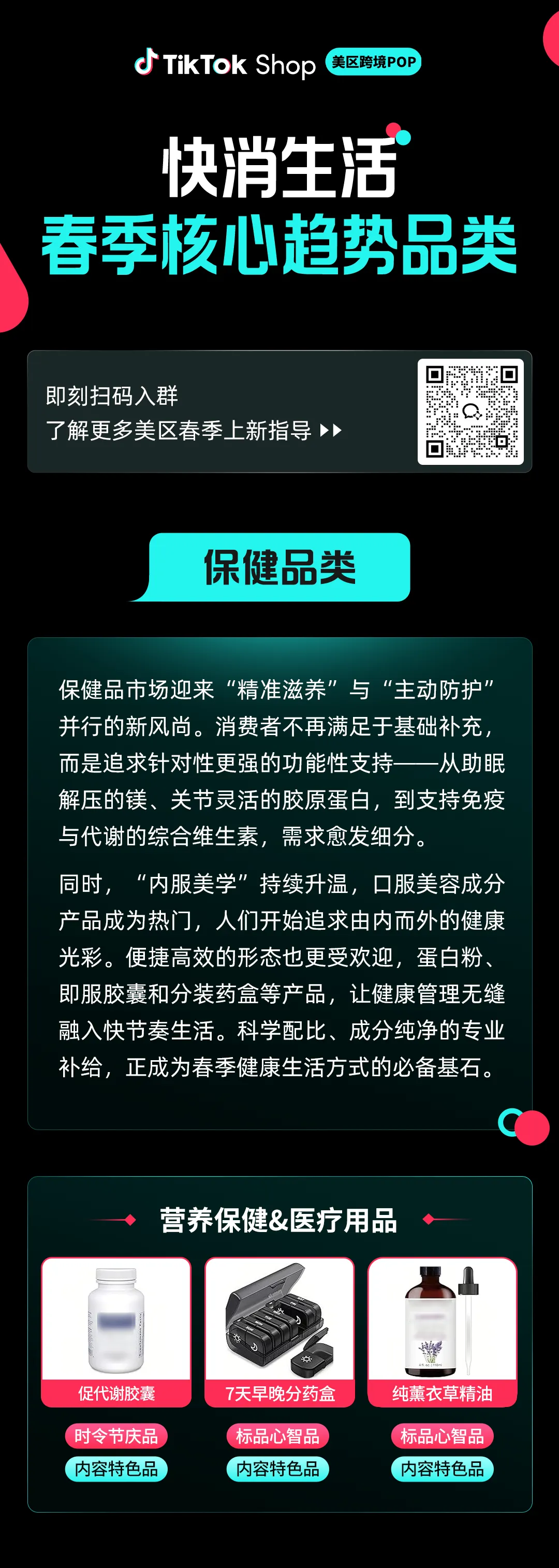随着春季消费需求旺盛,TikTok Shop跨境电商快消品市场,正迎来2月、3月春季上新热招期。美区跨境自运营(POP)商家如能精准把握春季上新趋势,将快速抢占趋势爆品先机!