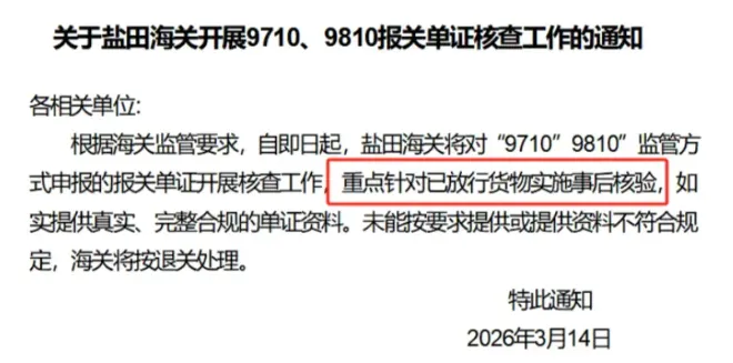 国内华南港口的查验力度也在升级。近期盐田港区、南沙港重点聚焦“跨境电商B2B直接出口”(9710)和“跨境电商出口海外仓”(9810)模式发起严查。其中,盐田口岸重点针对已放行货物实施事后核验(DR模式),最长追溯期长达三年,一旦被抽查,卖家需提供包括店铺后台截图、销售页面、海外仓协议、库存证明、银行流水及真实订单等全套资料。