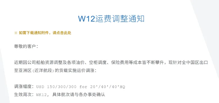 例如,有“亚洲运费市场风向标”之称的万海航运,宣布将于2026年4月1日起对其亚洲航线加收附加费,按每标准箱100 美元和每高箱200 美元收取。