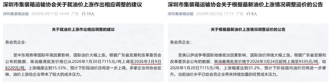 在国内集装箱港口,燃油成本上升给集装箱运输企业带来了显著的经营压力。根据深圳市集装箱运输协会的最新公告,柴油最高批发价从2026年1月20日的7115元 / 吨,涨至3月9日的8220元 / 吨;仅半个月后(3月24日),再度上调至9335 元 / 吨。短短15天内价格上涨1115元 / 吨,近两个月累计涨幅高达31.2%。