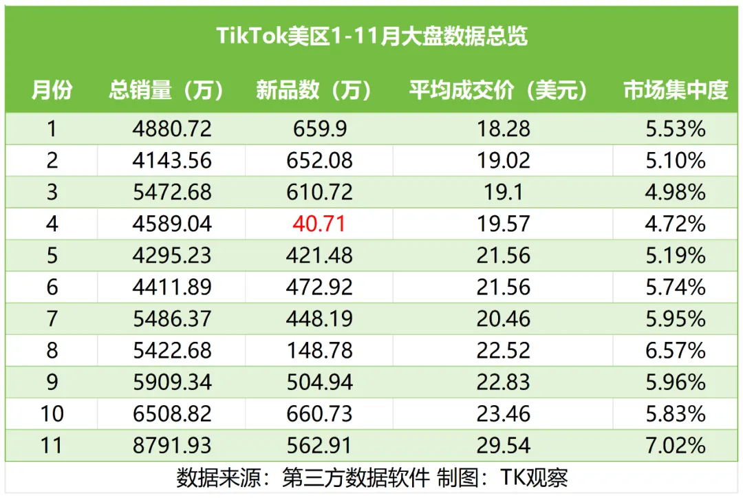 此前正值TikTok黑五大促,大促向来是卖家集中冲刺销量的重要节点,而此次大促不出意外地再次助力TikTok美区实现销售数据突破性飙升。为弱化大促节点期带来的短期数据波动影响,更客观呈现美区全年趋势,TK观察整理了TikTok美区1-11月大盘数据总览。