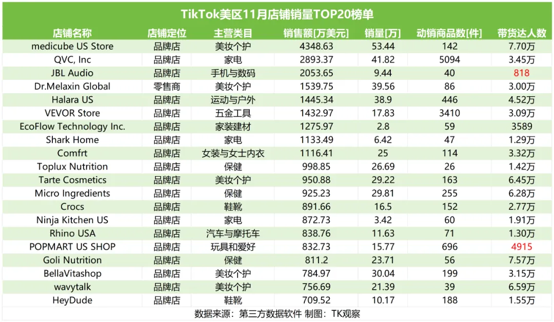 从TikTok美区11月店铺销售额TOP20榜单来看,上榜店铺均为品牌店,仅Dr.Melaxin Global一家店铺以“零售店”身份入围,事实上,总览美区6-11月销售额榜TOP20店铺类型,TK观察发现,除Dr.Melaxin Global外,基本均为品牌店,这也再次印证TikTok美区品牌化属性逐渐显现,品牌自带的认知度和产品品控能力更符合美区用户消费倾向,而Dr.Melaxin Global能跻身榜单前列,或许与其选择布局美妆个护中护肤细分类目、建联达人数量和质量有关。