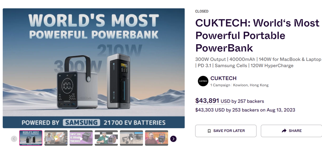 2023 年,他们就在 Indiegogo 上发起了 210W、300W、40000mAh 的超大功率移动电源众筹项目,并以“全球最强便携电源”的定位切入市场。该项目最终吸引了 257 名支持者,筹得 43,891 美元。
