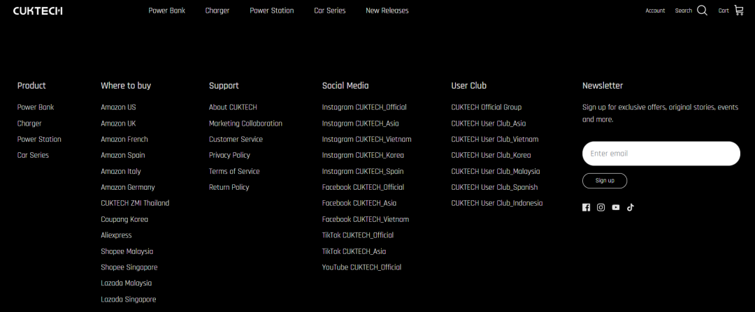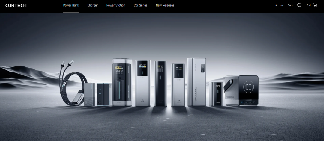 再来看 CUKTECH 的独立站,它并不是传统意义上的销售平台,而更像是一个“流量中枢”。从风格上看,CUKTECH 的独立站延续了“硬核科技+年轻潮酷”的视觉基调,整体配色以黑白灰为主,既突出了科技感,也与其高性能充电器的定位相契合。