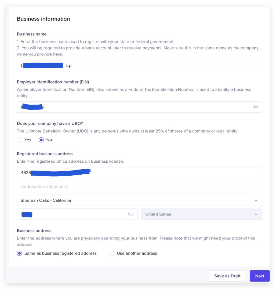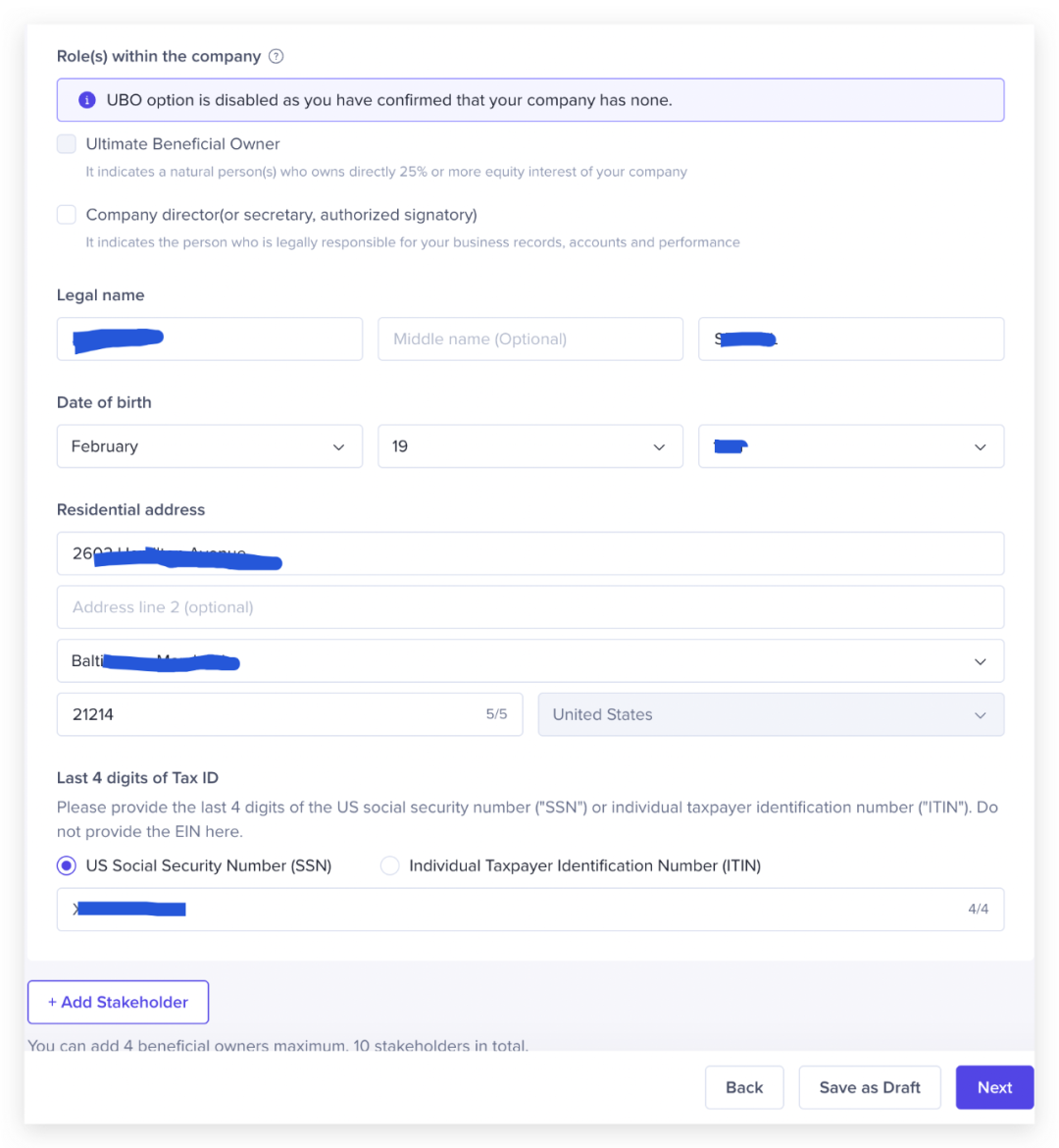 4、继续往下填企业信息,公司名称如实填写,这边提示说会要求你填写UBO与否,这个是指是否有大于25%的最终受益人,请根据你的美国企业资料实际情况填写。