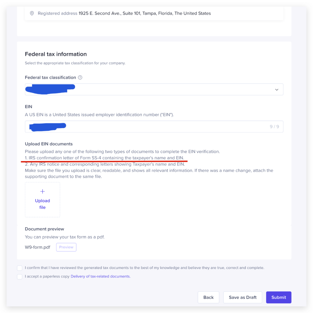 底下是要求提交用于证明EIN码真实性的文件,一般注册美国公司都会获得。