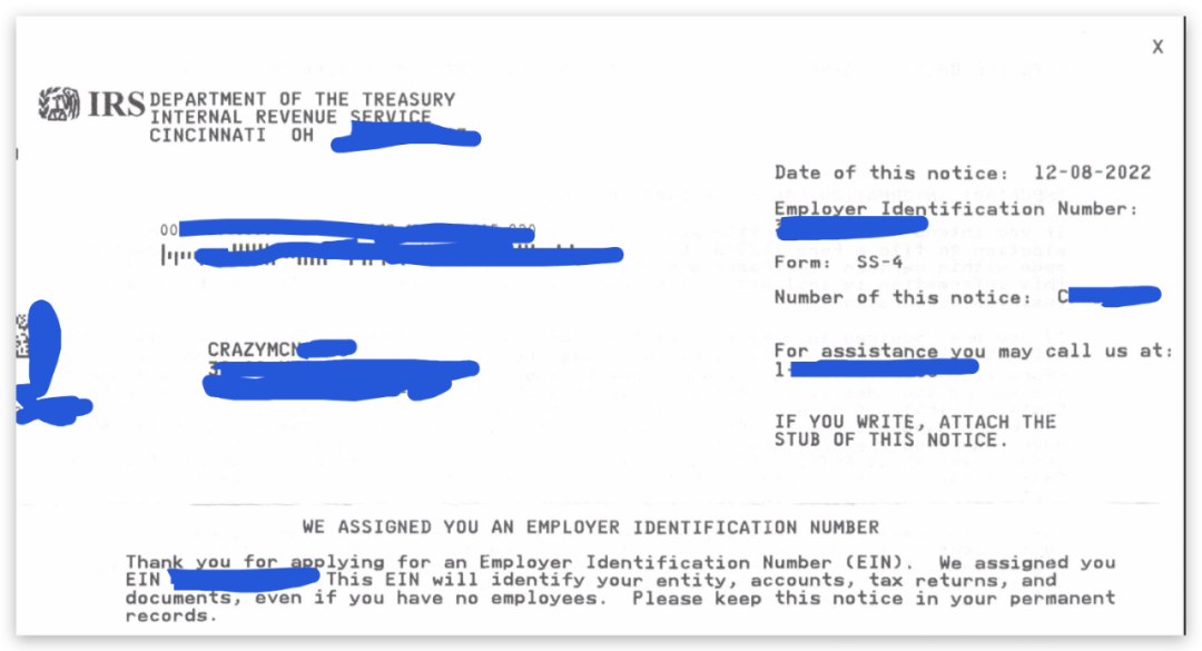IRS发放的文件,里面有详细罗列你的企业名称、EIN码。