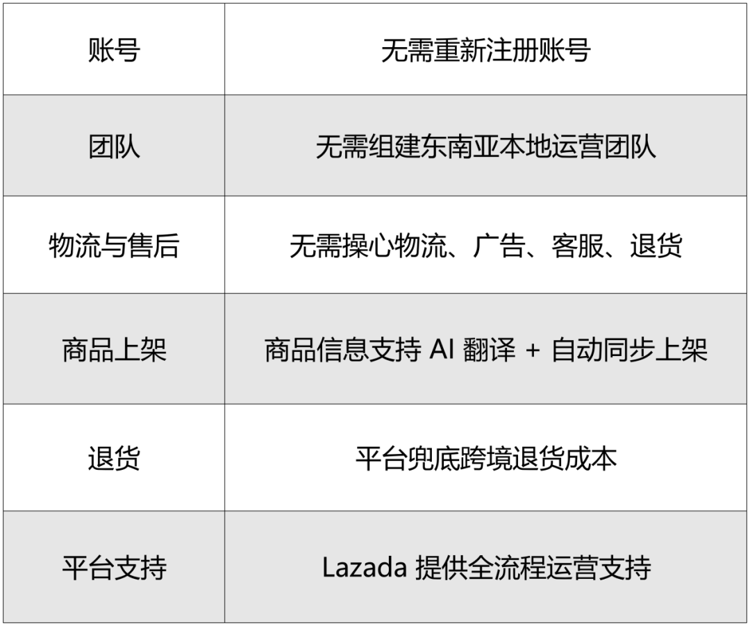 其次,商家要做的事比较简单,将货物发到国内的中转仓后,几乎可以“甩手”不管了,而流量、客服、国际运输、终端配送等都由 Lazada 负责。非常重要的一点是,商品一旦出境,如果出现退货,那么,相关的退货成本,平台也会全额兜底。