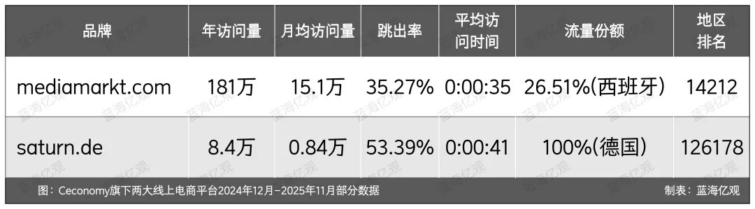 相比之下,这两个品牌的线上表现,远不及它们在线下的影响力。近一年,mediamarkt 的线上网站访问量仅 181 万次,月均访问量约 15.1 万次;而 saturn.de 的线上体量更小,全年仅 8.4 万次访问,月均访问量不足 1 万次。