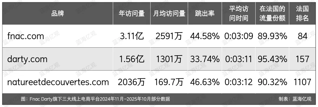 近一年,Fnac 的年访问量达 3.11 亿,其次为Darty(1.56 亿)、Nature & Découvertes(2036 万)。