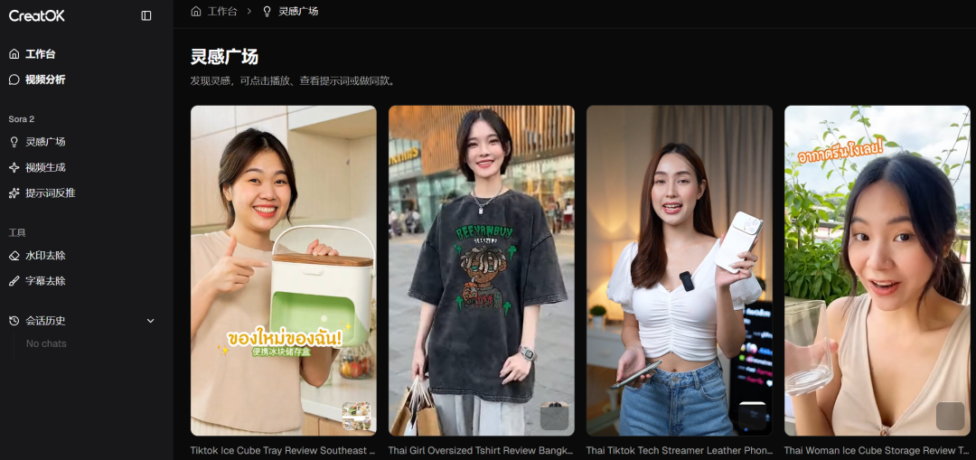 你刷到 TikTok上 “卖爆10万单” 的颈枕视频,不用猜 “它为啥火”:打开 CreatOK 的「灵感广场,直接能看到同品类的爆款案例 —— 比如 “记忆棉颈枕→办公室加班场景 + 揉脖子缓解疲劳”,点击 “查看提示词”,就能拿到完整的 “流量指令”:“25 秒,办公室场景,白领揉脖子,颈枕贴合颈椎,光线柔和,特写颈枕 logo”。