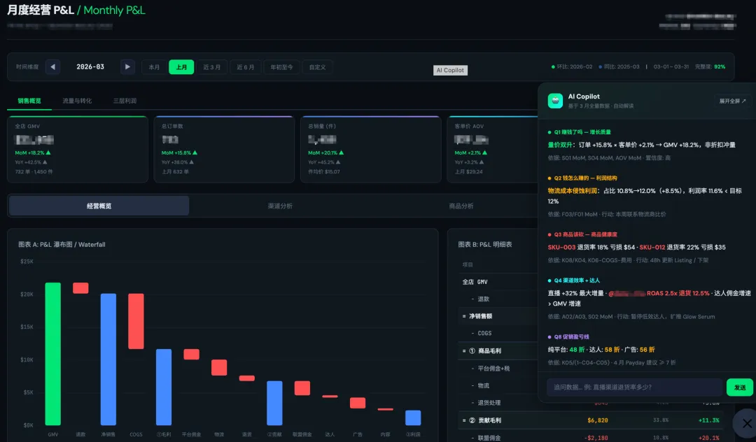 GMV、访问量、转化率、退货率、达人活跃度、现金流……全部自动抓取(通过 TikTok 官方 API),然后 AI 出一份"Copilot 解读":昨天量价双升还是异常告警?哪个达人掉量了?哪个 SKU 的退货率突然升高?