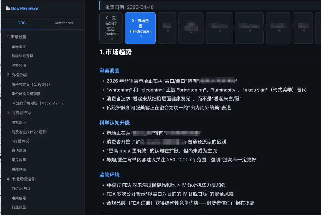 60 分"我是菲律宾的口服美白补充剂品牌,竞品叫 XX,目标客户 25-35 岁女性,核心卖点是 XX" |