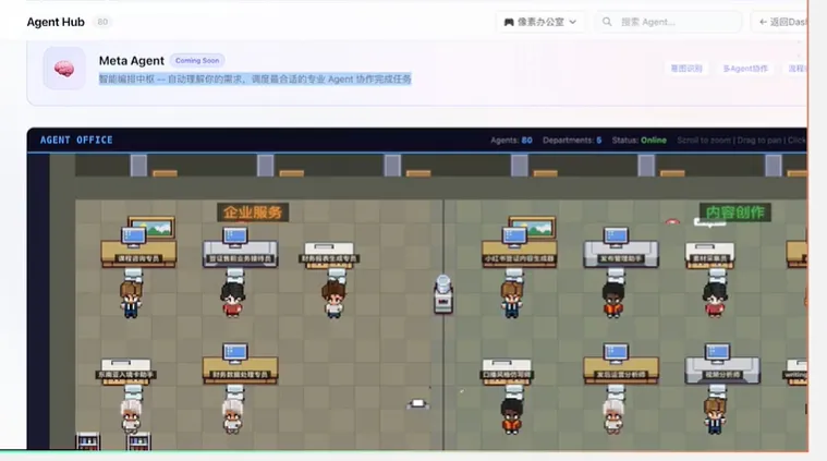 Musk 看着那个像游戏界面一样的管理后台——每个 Agent 是一个小人,点击脑袋就能发起会话,流程看板上蓝色的是 AI 节点,黄色的是人工审核点。